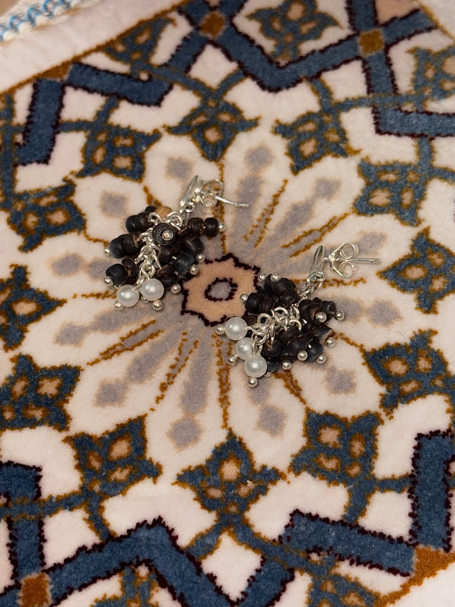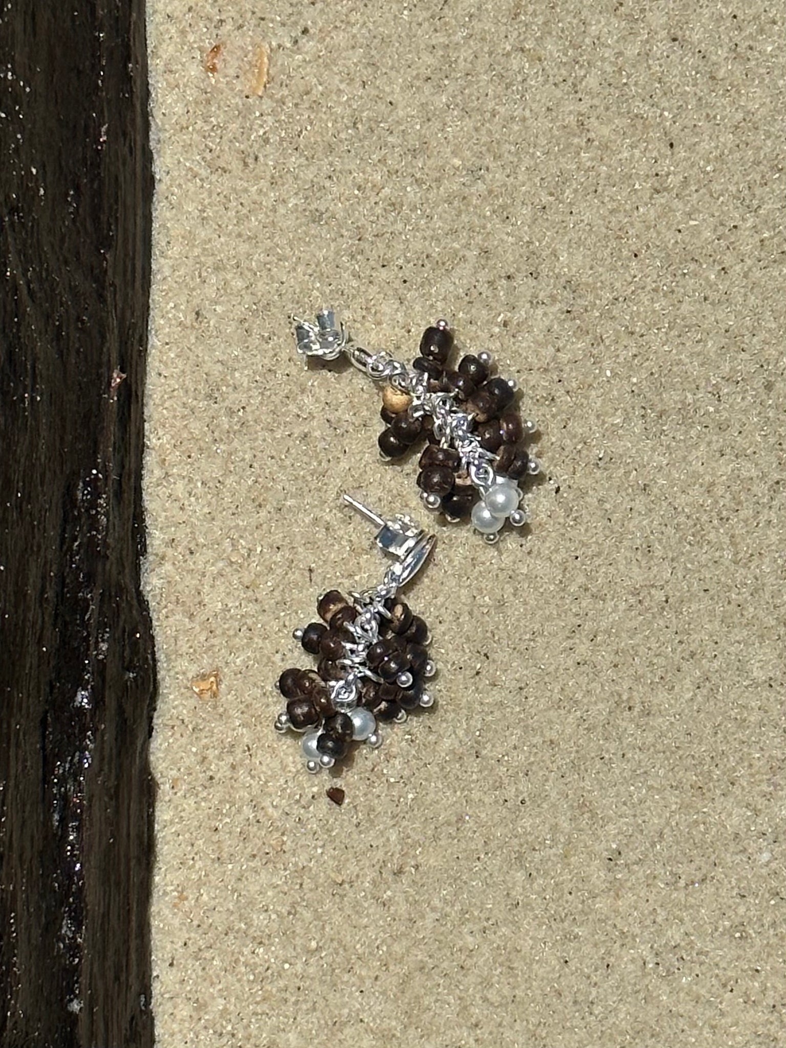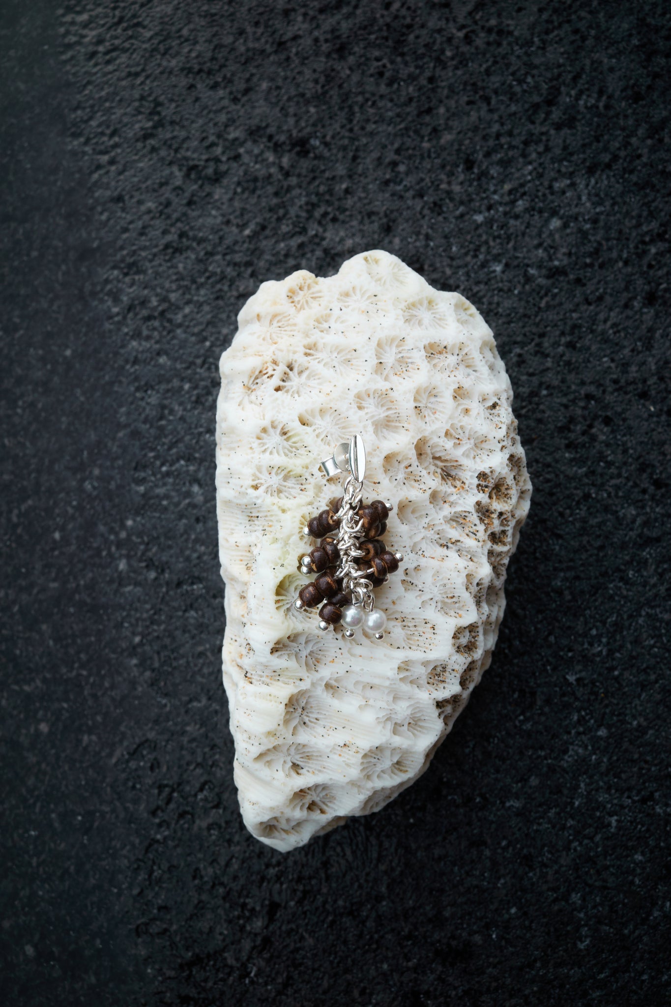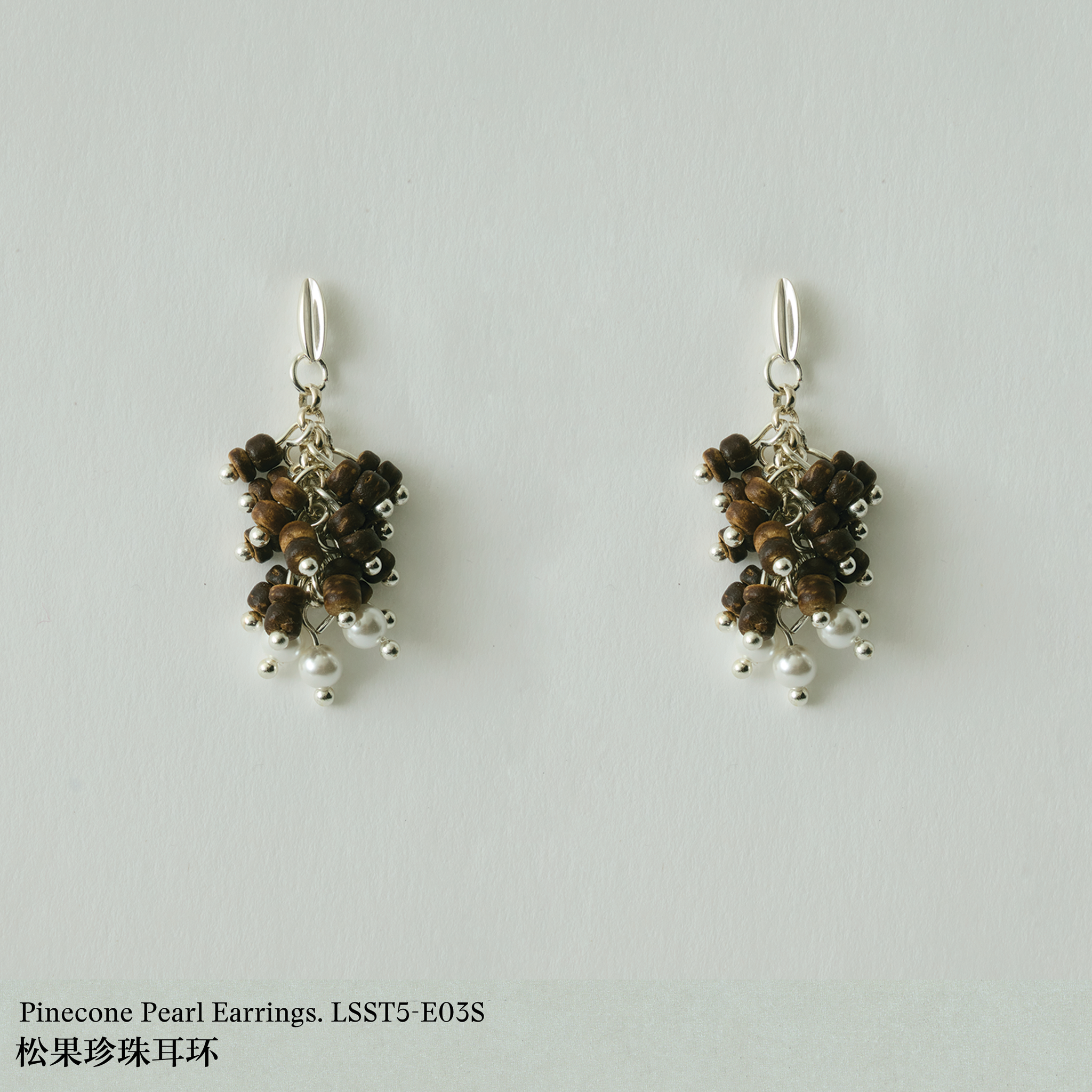 Material: Sterling silver studs, hook in silver-plated copper, with natural shell pearls and coconut shell beads, logo engraved at earrings (sterling silver).